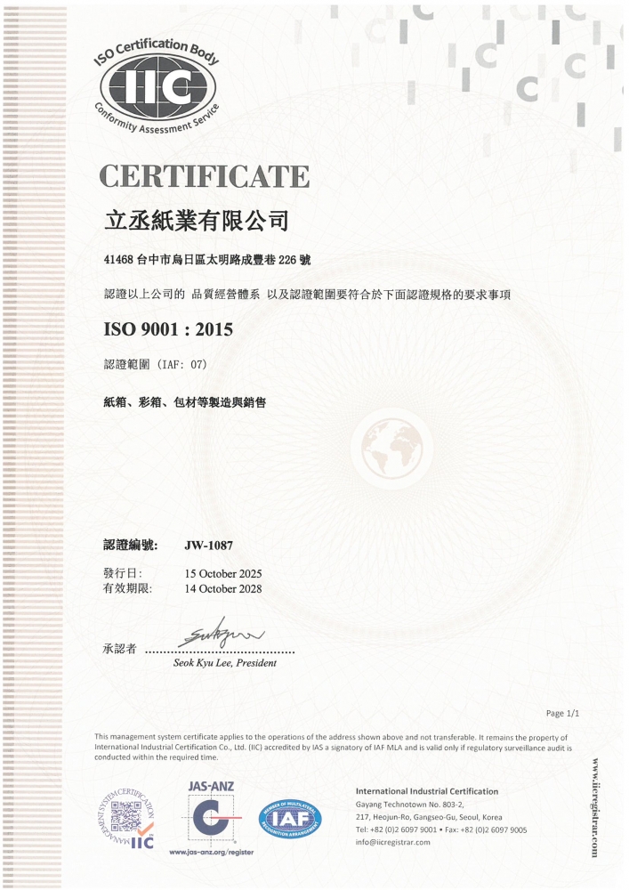 為了環保綠化我們於2023年加入FSC體制為我們的環境盡一份心力,使我們的生活環境能夠愈來愈美好~ 2025年導入ISO9001:2015品質管理系統,期許用優良的品質與專業的製造能力來服務大眾。